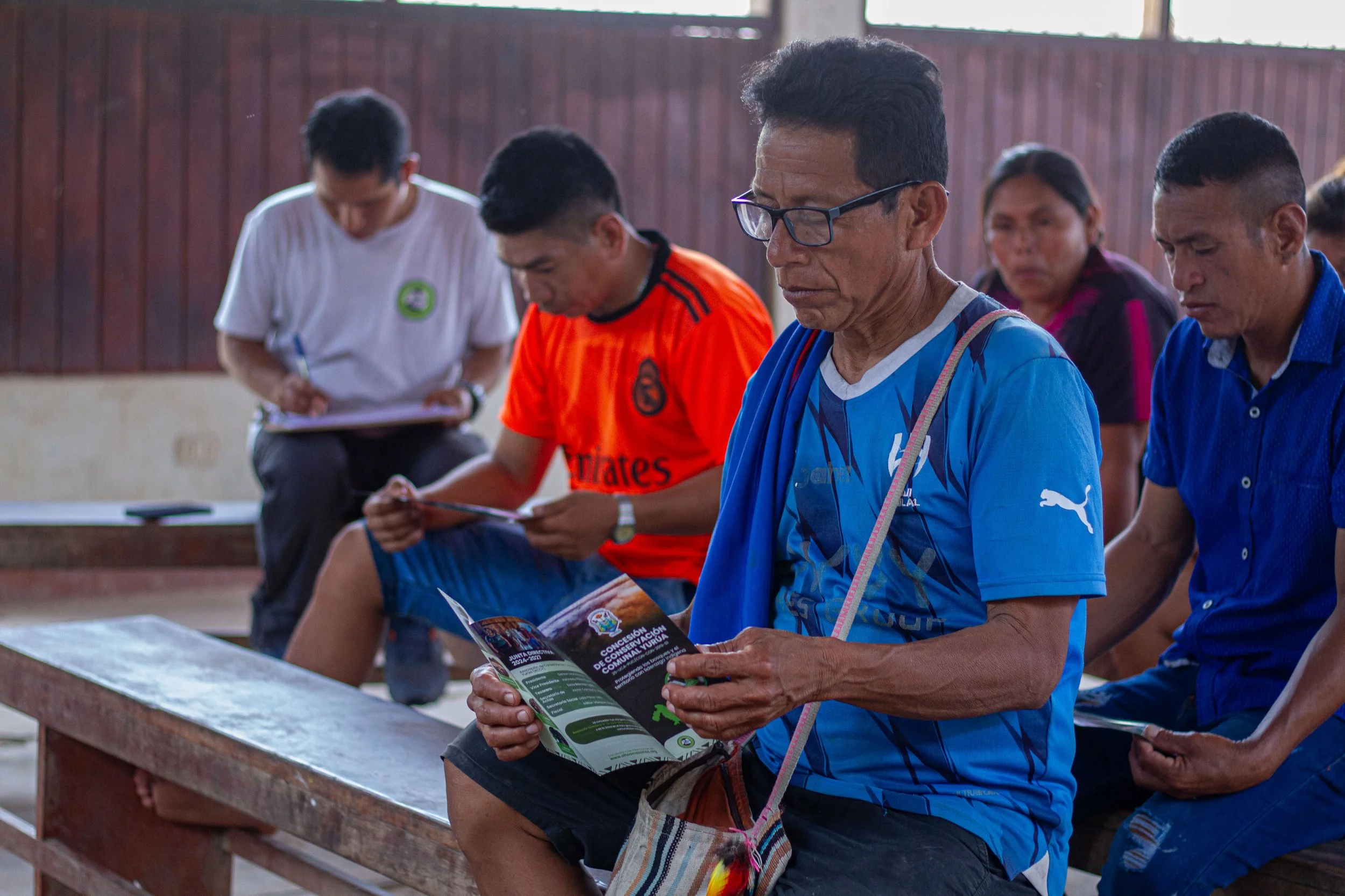 President of ACC-Yurúa reviewing informational materials within the framework of the process to report the Conservation Concession as an OECM.