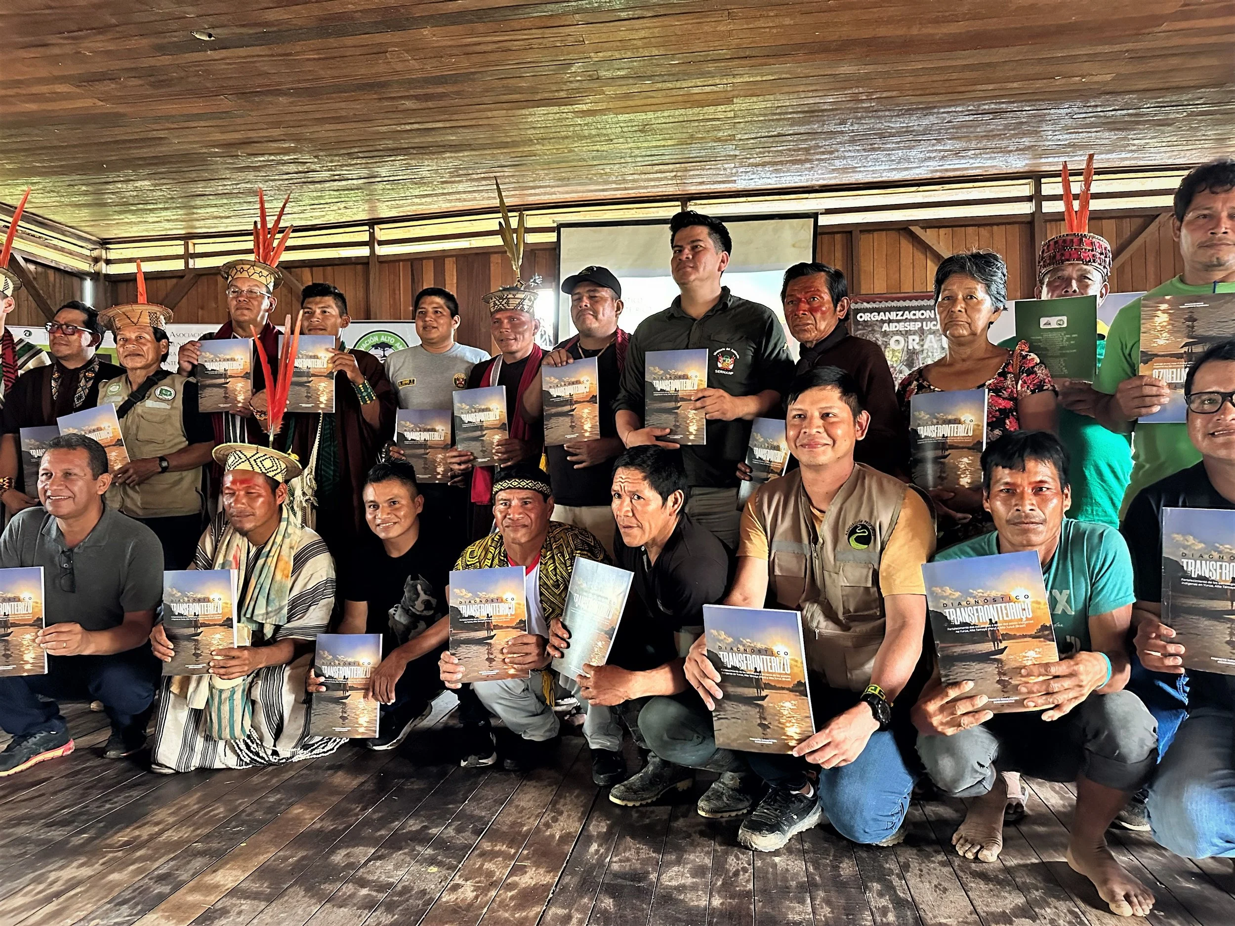 Participants with copies of the “Transboundary Report: Strengthening Strategies and Actions of the Indigenous Peoples in Yurúa, Alto Tamaya (Peru) and Alto Juruá (Brazil).”