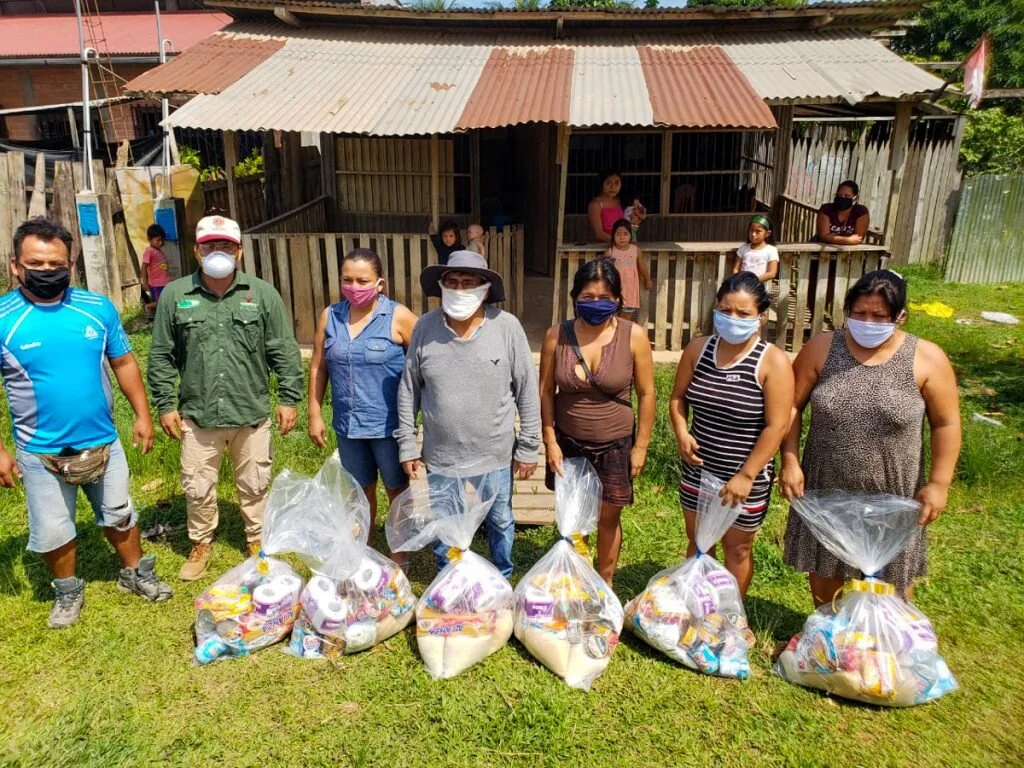 Indigenous families stranded in Pucallpa receiving bags of food and essential supplies.