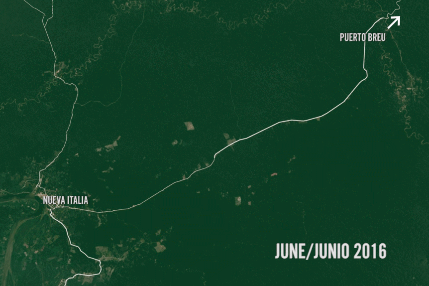 Increased deforestation along the old logging road being improved to connect Nueva Italia to Puerto Breu, Yurua from June 2016 to September 2020, with a dramatic increase since 2019. (Source: 2020, Planet Labs Inc. thanks to the Norwegian International Climate and Forest Initiative, compiled by David Weiss, CEES, WFU).